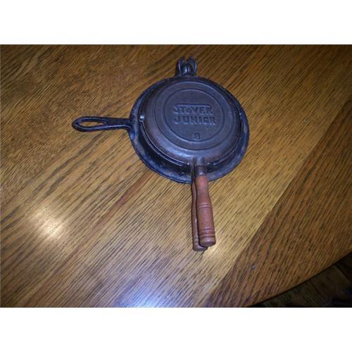 I purchased some wonderful childrens items,some are very hard to find items.This is a darling child size Stover Junior waffle iron with wooden handles.Measures 7 1/8" across to end of handles.Just adorable and in great condition.