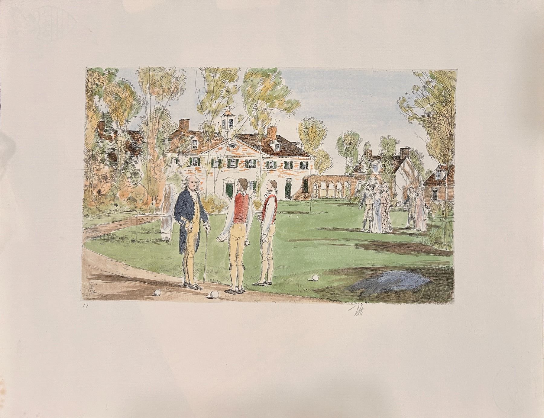 Childe Hassam "On the Lawn"; 8" x 13.25" handcolored print; Signed lower right, # 17 lower left; Dated 1937 in plate