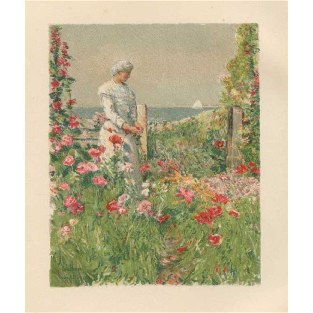 Childe Hassam Chromolithograph - "In The Garden" - Medium: Chromolithograph (After The Watercolor). This Beautiful Antique Print Was Published In A Small Edition (Most Likely Around 500) In 1895 To Illustrate A Rare Celia Thaxter Volume. Celia Thaxter And Childe Hassam Were Close Friends, And Some Of His Loveliest Compositions Were Of Her Isle Of Shoals Garden. Signed In The Plate (Not By Hand). Image Size: 4 1/2 X 3 3/4 Inches. This Is A Rich Impression On Cream Wove Paper - Professionally Framed & Matted - Comes With Certificate - -