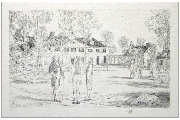 Hassam pencil-signed etching "Bowling on the Green" - Medium: Original etching. Signed in pencil with Childe Hassam's monogram signature; the number "20" is annotated at the lower left. Executed in 1932 for a portfolio of etchings commemorating the life of George Washington. Printed on watermarked laid paper, with full margins. Size: 8 1/4 x 13 3/8 inches (plate); 217 x 340mm. - Professionally Framed & Matted - Comes With Certificate - -