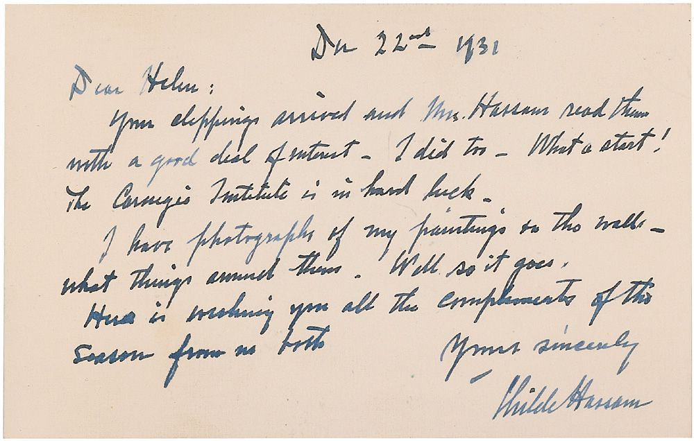 American Impressionist painter (1859–1935) who helped introduce Impressionism to Americans, best known for his urban and coastal scenes. ALS, one page, 5 x 3.25, December 22, 1931. A letter to Helen Beatty. In full: “Your clippings arrived and Mrs. Hassam read them with a good deal of interest—I did too—What a start! The Carnegie Institute is in hard luck. I have photographs of my paintings on the walls—what things around them. Well so it goes. Here is wishing you all the complements of the season from us both.” In fine condition, with a lighter shade to some words. Accompanied by original mailing envelope addressed in his hand.