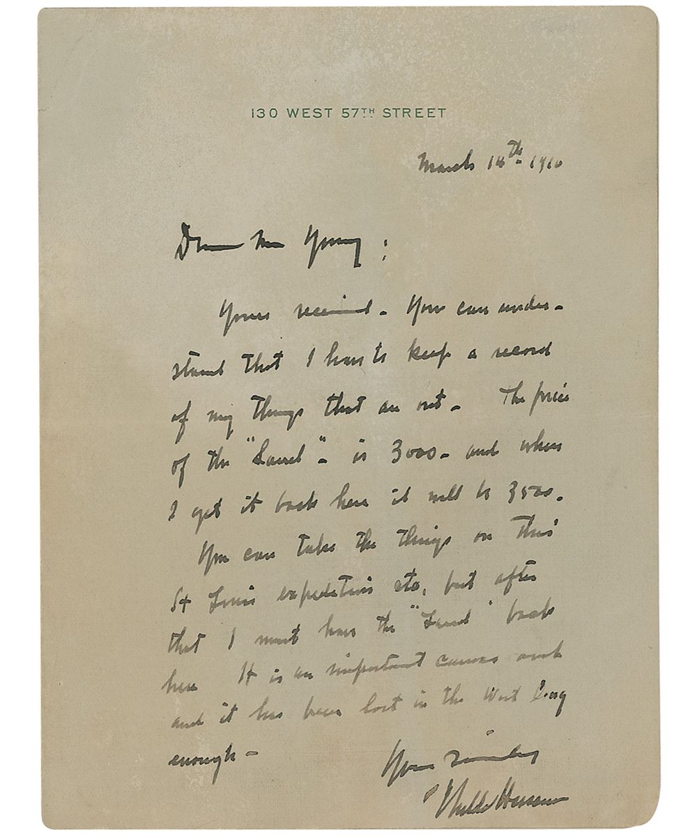American Impressionist painter (1859–1935) who helped introduce Impressionism to Americans, best known for his urban and coastal scenes. ALS, one page, 4.75 x 6.5, personal letterhead, March 14, 1910. Letter to Mrs. Young. In full: “You can understand that I have to keep a record of my things that are out. The price of the 'Laurel' is 3,000 and when I get it back here it will be 3,500. You can take the things on this St. Louis exposition, etc., but after that I must have the 'Laurel' back here. It is an important canvas and it has been lost in the West long enough.” In very good condition, with central horizontal fold, partial separation along spine with blank integral second page, and scattered toning.