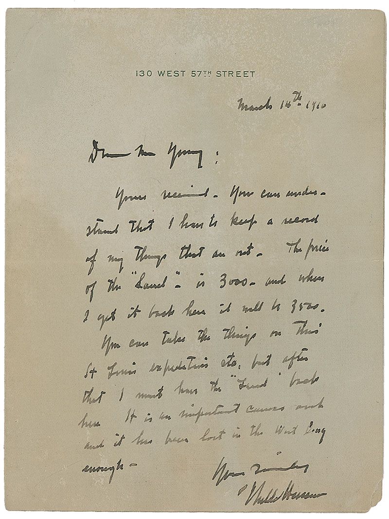 Painter (1859–1935) who helped introduce Impressionism to Americans, best known for his urban and coastal scenes. ALS, one page, 4.75 x 6.5, personal letterhead, March 14, 1910. Letter to Mrs. Young. In full: “You can understand that I have to keep a record of my things that are out. The price of the 'Laurel' is 3,000 and when I get it back here it will be 3,500. You can take the things on this St. Louis exposition, etc., but after that I must have the 'Laurel' back here. It is an important canvas and it has been lost in the West long enough.” In very good condition, with scattered toning and partial separation along spine with blank integral second page.