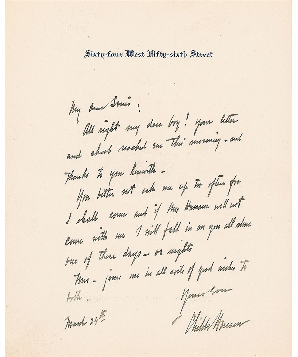 Painter (1859–1935) who helped introduce Impressionism to Americans, best known for his urban and coastal scenes. ALS, one page, 5.25 x 6.5, personal letterhead, March 24, 1902. Letter to Louis Shipman. In part: “All right my dear boy!…You better not ask me up too often for I shall come and if Mrs. Hassam will not come with me I will fall in on you all alone one of these days—or nights.” In very fine condition. Accompanied by the original mailing envelope, addressed in Hassam’s hand.