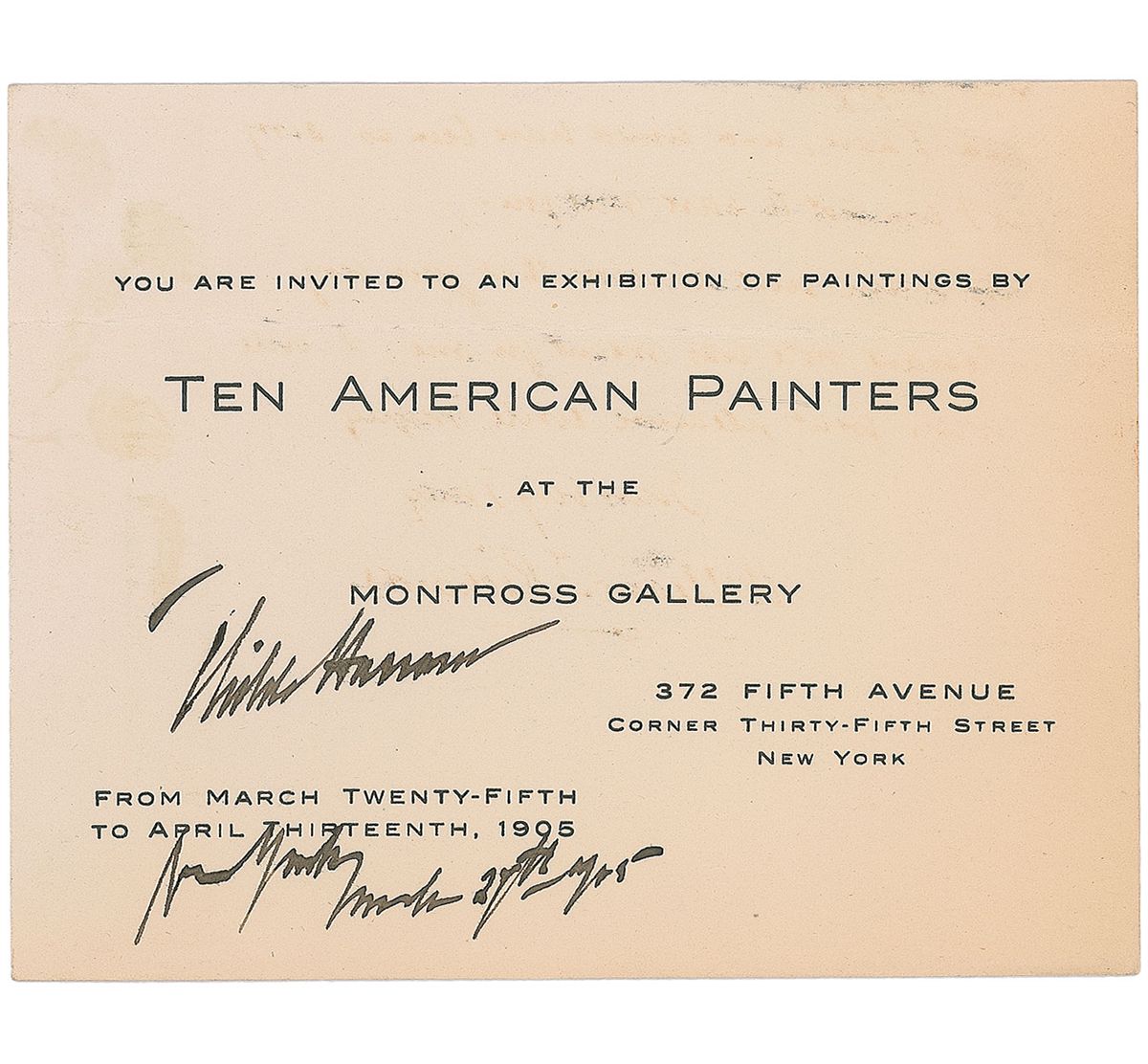 Uncommon invitation to an exhibition of paintings by the ‘Ten American Painters,’ held at the Montross Gallery in New York from March 25 to April 13, 1905, 4.75 x 3.75, boldly signed in black ink, “Childe Hassam, New York, March 27th 1905.” A horizontal crease passing through the top and light scattered marks and soiling, otherwise fine condition. Often known simply as ‘The Ten,’ the exhibited group had broken away from the Society of American Artists over questions of artistic philosophy and included some of the finest painters of the day, such as William Merritt Chase, Frank W. Benson, Edmund C. Tarbell, and Thomas Dewing.