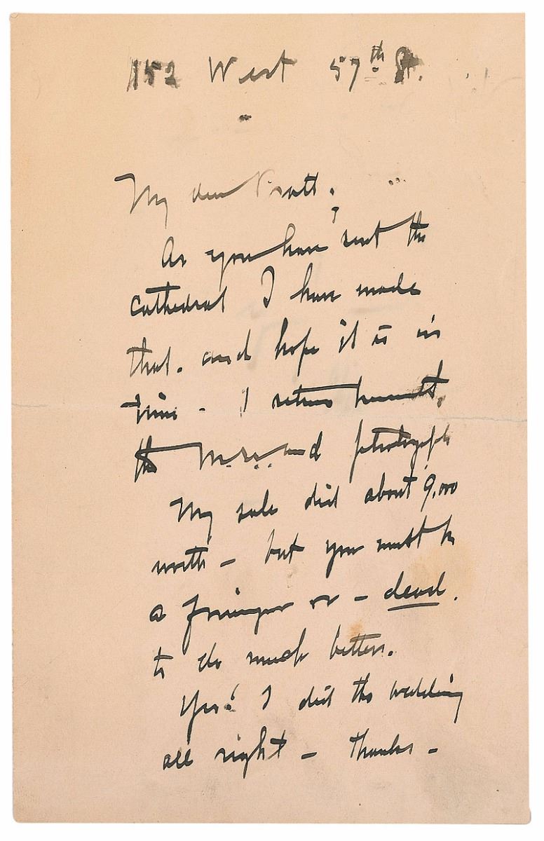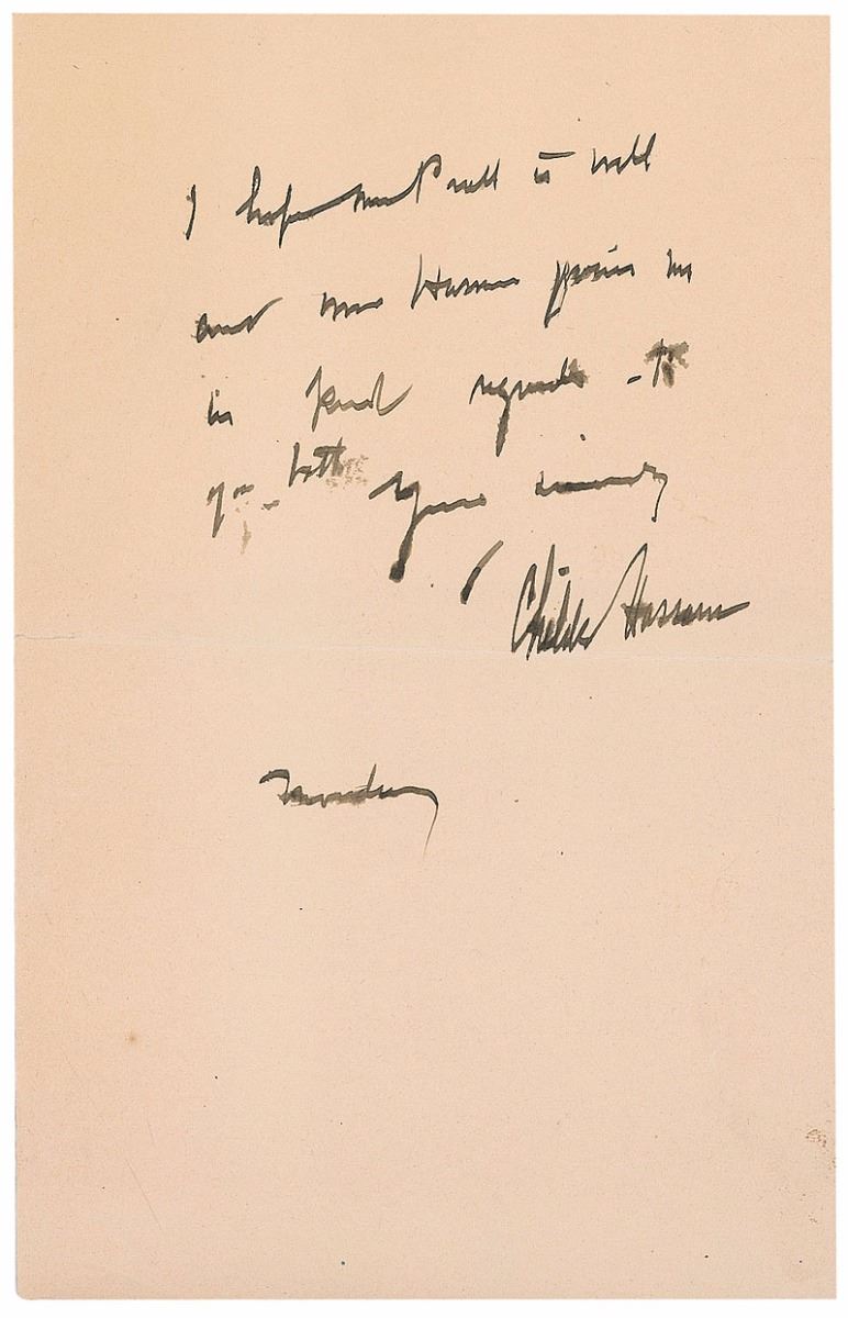 Painter (1859–1935) who helped introduce Impressionism to Americans, best known for his urban and coastal scenes. ALS, two pages, 4.5 x 7, no date. Letter to Mr. Pratt, most likely Hassam’s collaborator, author and illustrator Charles Stuart Pratt. In part: “As you have sent the cathedral I have made that and hope it is in time. I return herewith the M. W.…photograph. My sale did about 9,000 worth—but you must be a foreigner or—dead to do much better. Yes! I did the wedding all right. Thanks. I hope Mrs. Pratt is well and Mrs. Hassam joins me in kind regards to you both.” Scattered light soiling and wrinkling, otherwise fine condition.