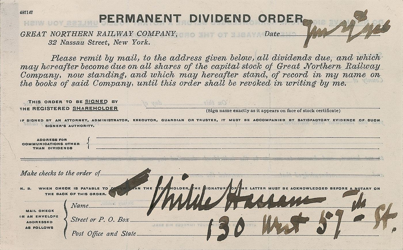 DS, one page, 8 x 5, no date. Permanent dividend order in relation to the Great Northern Railway Company. Signed boldly at the conclusion in ink, "Childe Hassam, 130 West 57th St.," adding the date in the upper right corner. In fine condition.