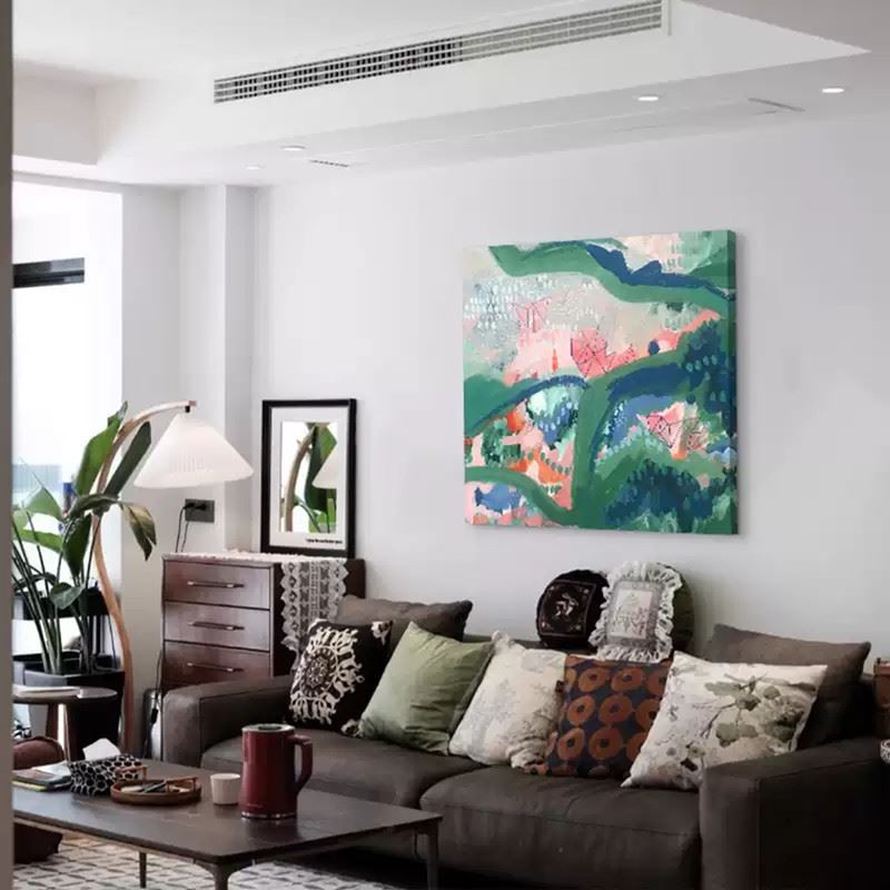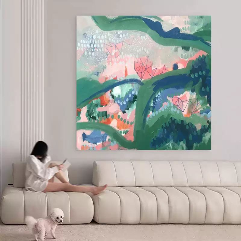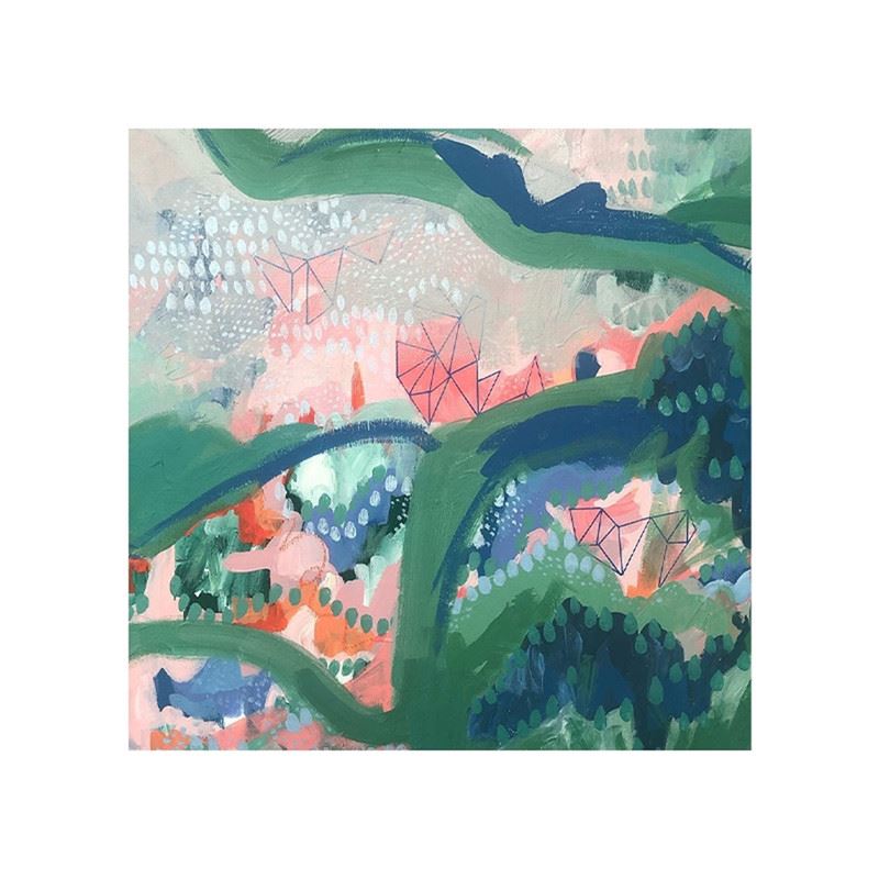Curving green bands resemble hills and winding paths from a child’s sketch, while dotted patterns and geometric lines evoke candies, kites, and paper folds scattered through a soft pink world. The scene is simple yet full of imagination, like returning to an age when everything could turn into play. Dimensions: 24 x 24 inches.