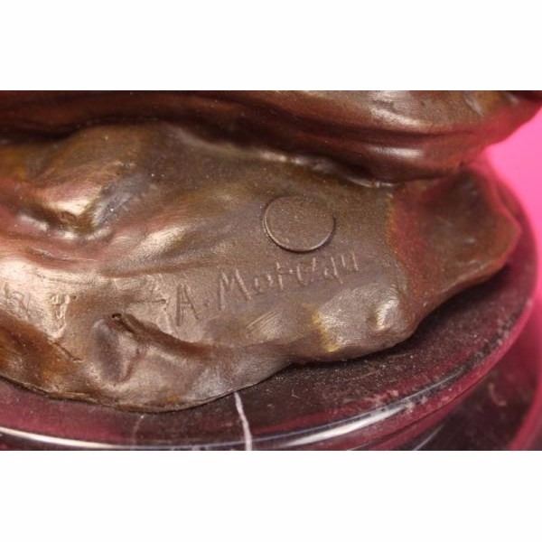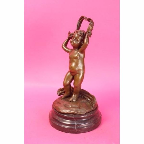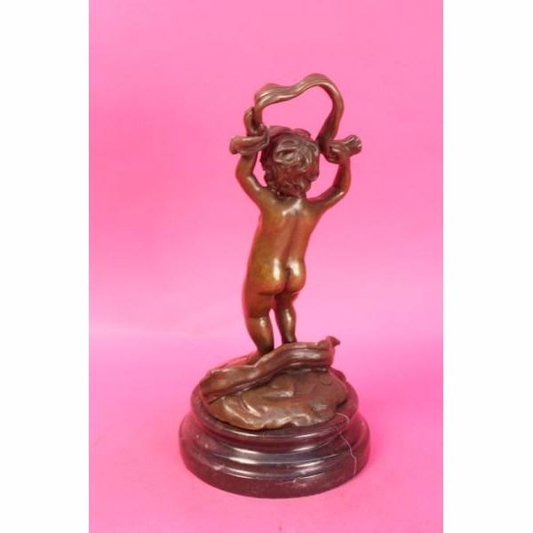 The nude, cherub-like child stands in a relaxed contrapposto pose. Hisarms outstretch above him waving a fabric banner in a carefree andjoyful manner. The 100% bronze sculptures tactility captures theviewer with his chubby contour and smooth, brown patina finish. Thisangelic sculpture was cast using the ancient "Lost Wax Method" andmounted upon a black marble base signed by the artist A. Moreau. Condition: This sculpture is in perfect condition. Bronze Dimensions with Marble Base:Height 11" x Width 6" Marble Dimensions: Diameter 6" Height without base: 10" Weight : 8 LBS Inventory : 27DS2612772