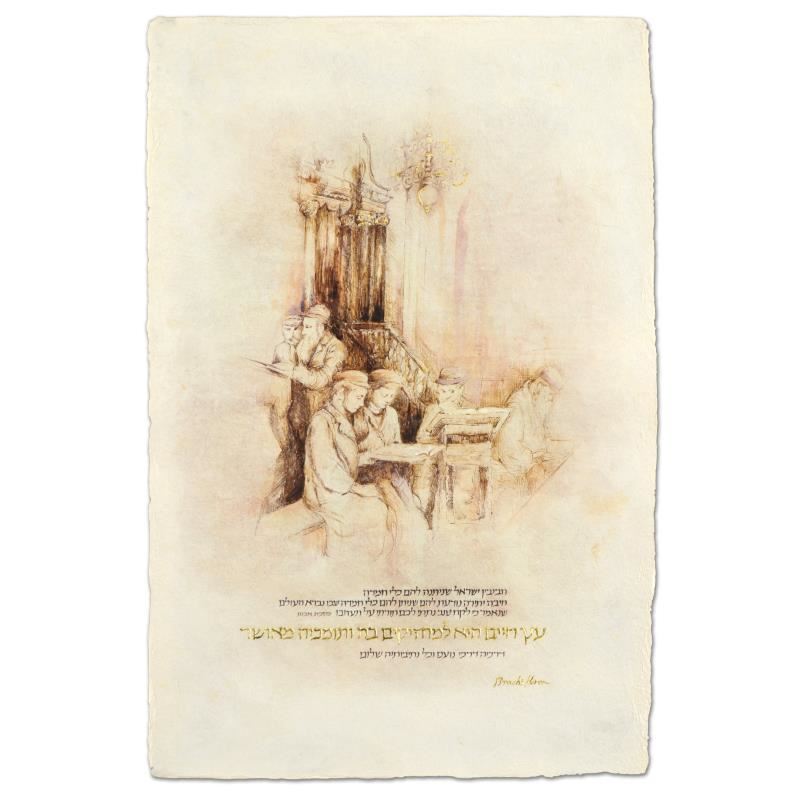 "Children Learning" is a mixed media giclee on handmade Indian paper with goldleaf by Brachi Horen, hand signed by the artist! This creation received personal attention by the artist in the form of water coloring and gilding. Includes Certificate of Authenticity! Measures approx. 15.5" x 23" (with border), 12" x 18" (image).