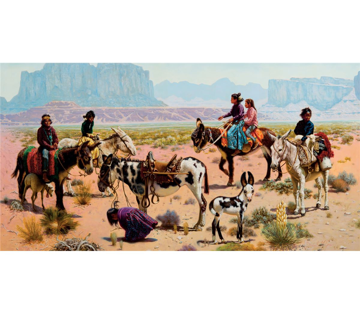 Children of the Sun refers to the famous Navajo story of Asdza´a´ na´dleehe´, or Changing Woman, the offspring of First Man and First Woman and of Sky and Earth. She symbolizes the earth and the order of the universe—spring, summer, fall, winter— growing old but never dying, and being renewed every year.. Changing Woman bore two children with the Sun: Naaye´e´’ neizgha´ni´, Monster Slayer, and To ba´ji´sh chi´ni´, Child of War, who clear the Earth of monsters and make it safe for humans. She created the ancestors of the Navajo people from pieces of her own skin and taught the Blessingway Ceremony to the Navajo. In this painting, Brownell McGrew finds some humor in these Children of the Sun, who, like all children, are, at various times, eager to learn, curious, distracted, proud. They, in turn, are mirrored in the motley of the burros they ride, but all are painted against the desert landscape that has seen every generation, and will see many more.