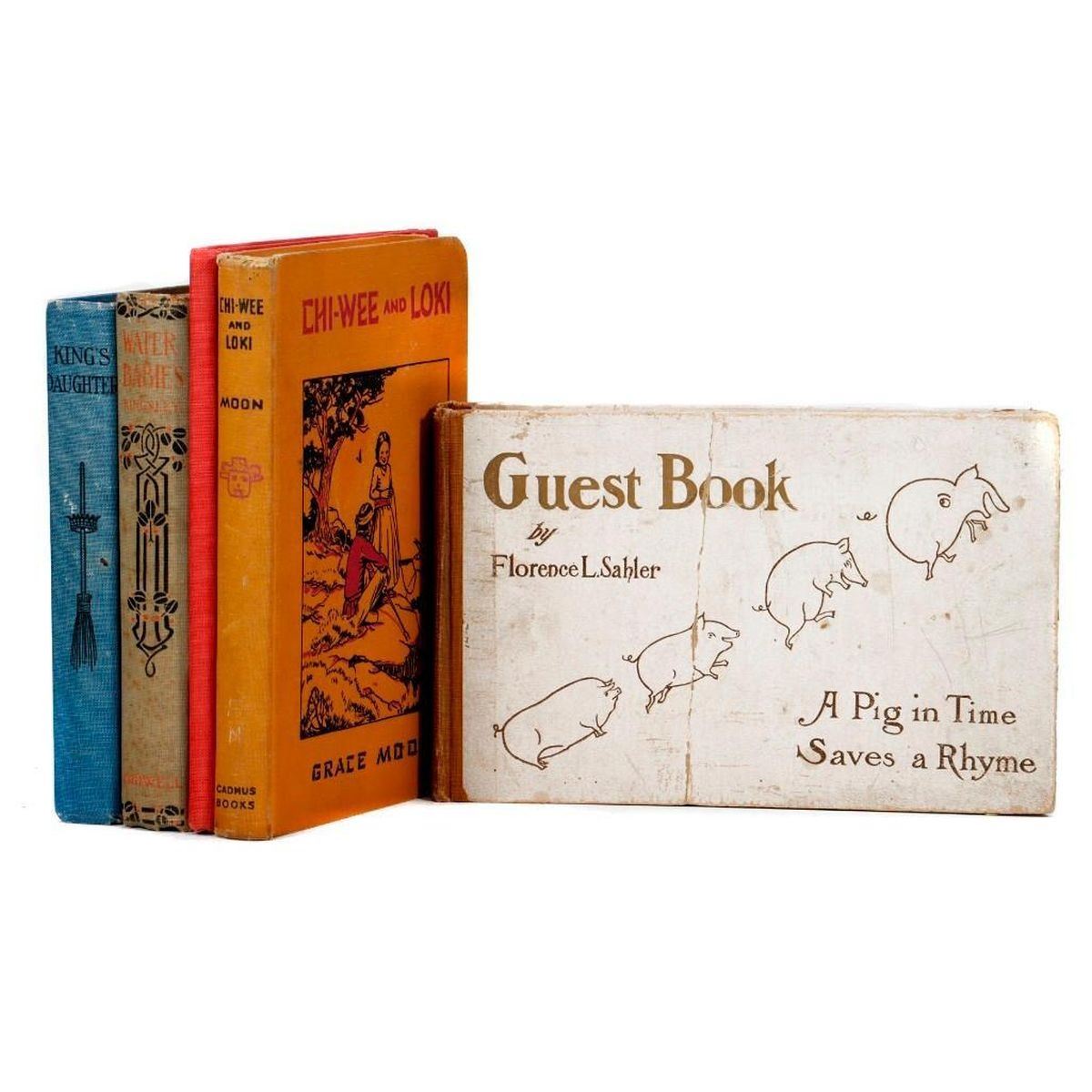 All Fair-Good: 1. CINDERELLA. Chicago, New York: M. A. Donohue & Company, n.d. 24 color illustrations. 2. THE KING'S DAUGHTER AND OTHER STORIES FOR GIRLS. Nashville etc.: Southern Publishing Association, 1910. Illustrated. 3. KINGSLEY, CHARLES. Water Babies. New York: Thomas Y. Crowell Company, 1895. Toning, slight splitting at front. 4. MOON, GRACE. Chi-Wee and Loki. Chicago: Cadmus Books, E. M. Hale and Company, 1926. Special edition of regular Doubleday, Doran & Company edition. With public school library label/inscription; corners bumped, wear to ends of spine. 5. SAHLER, FLORENCE L. Guest Book: A Pig in Time Saves a Rhyme. New York: Frederick A. Stokes Company, 1902. An eyes-closed drawing game; several pages have been filled in; splitting, loosened signatures, cover is bent.