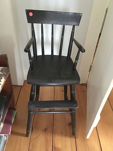 2 child's chairs, 1 children's high chair, 2 foot stools, 1 stool with embroided top. This lot is from a 100 year old Farm House in Sharon, CT, at the estate of Mr. John Morgan, a prominate Connecticut farmer, whose family has owned and farmed at this location for over 50 years. This lot can be picked up in Sharon CT for local buyers, or our shipper can pick up and ship to your location.
