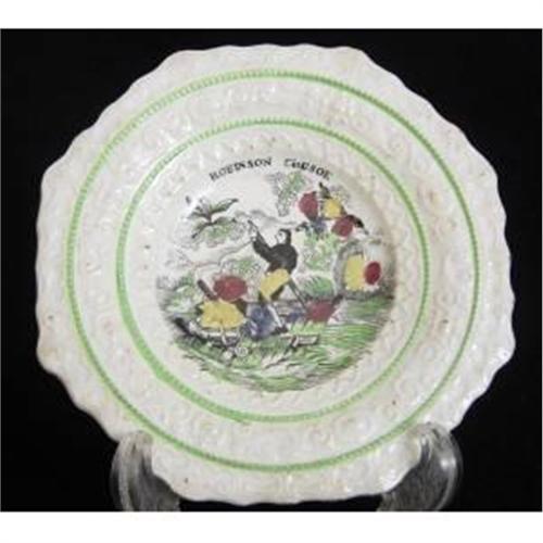 <p> Although unmarked the plate design was registered by Bailey and Ball, Longton in 1847. The print on the plate is based on JJ Grandville's illustrations for Robinson Crusoe.