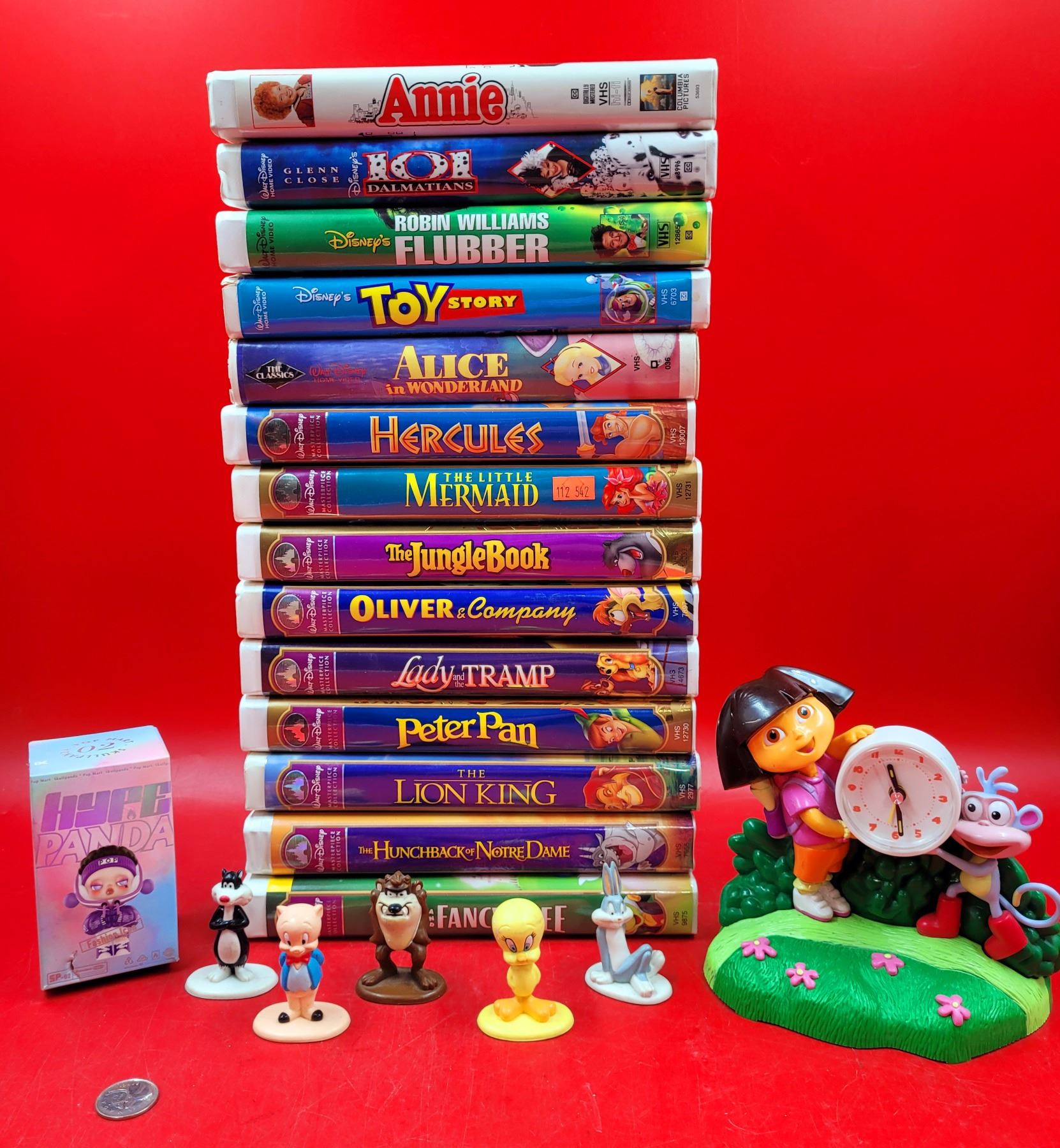 Children's VHSs, 1987 Arby's Looney Tunes Figures, Pop Mart Blind Box, & Dora Clock