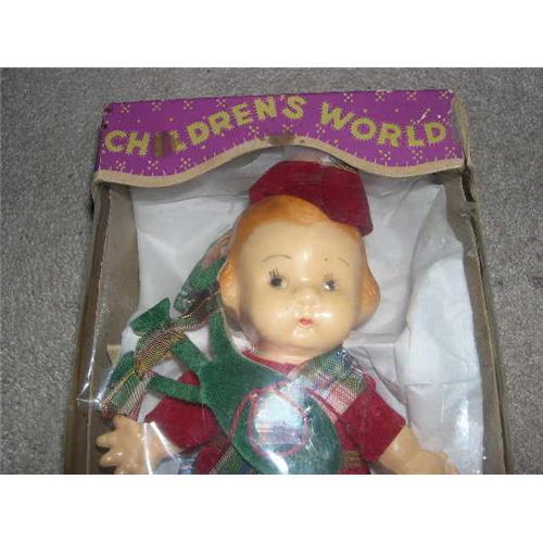 Children's World Sandy Scotsman in Box. Box is labeled #351- SANDY SCOTSMAN. Box reads Children"s World self walking costumed Bal Dolls Inc. Unfortunately the cellophane is broken on box but is still there with everything intact. Doll is great. This comes from a smoke free environment. Buyer to pay $15 for shipping, handling, and insurance. Thanks for viewing.