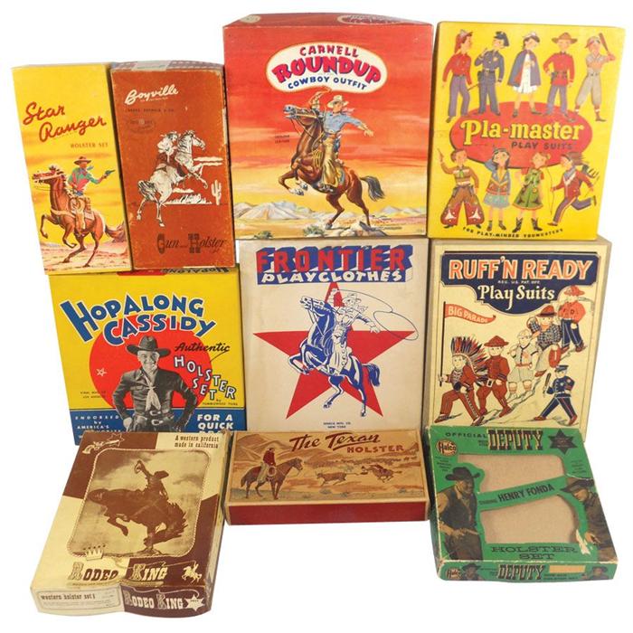 Children's holster set box & Western clothing boxes (10), nice boxes w/colorful graphics, c.1940's-1