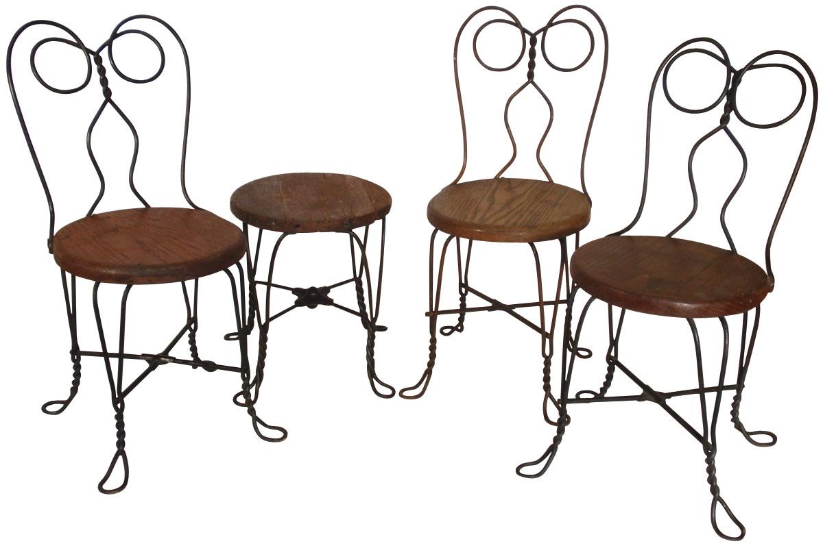 Children's ice cream chairs (3) & stool, twisted metal frame w/wood seats, Good to VG cond, 26"H.