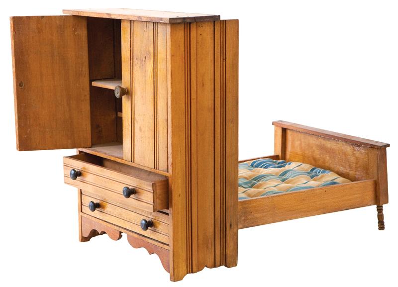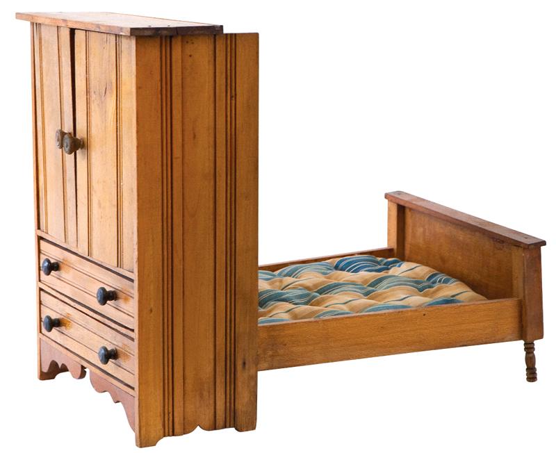 Children's toy murphy bed & wardrobe combination, wood w/ticking mattress, c.1910, a real cutie in E