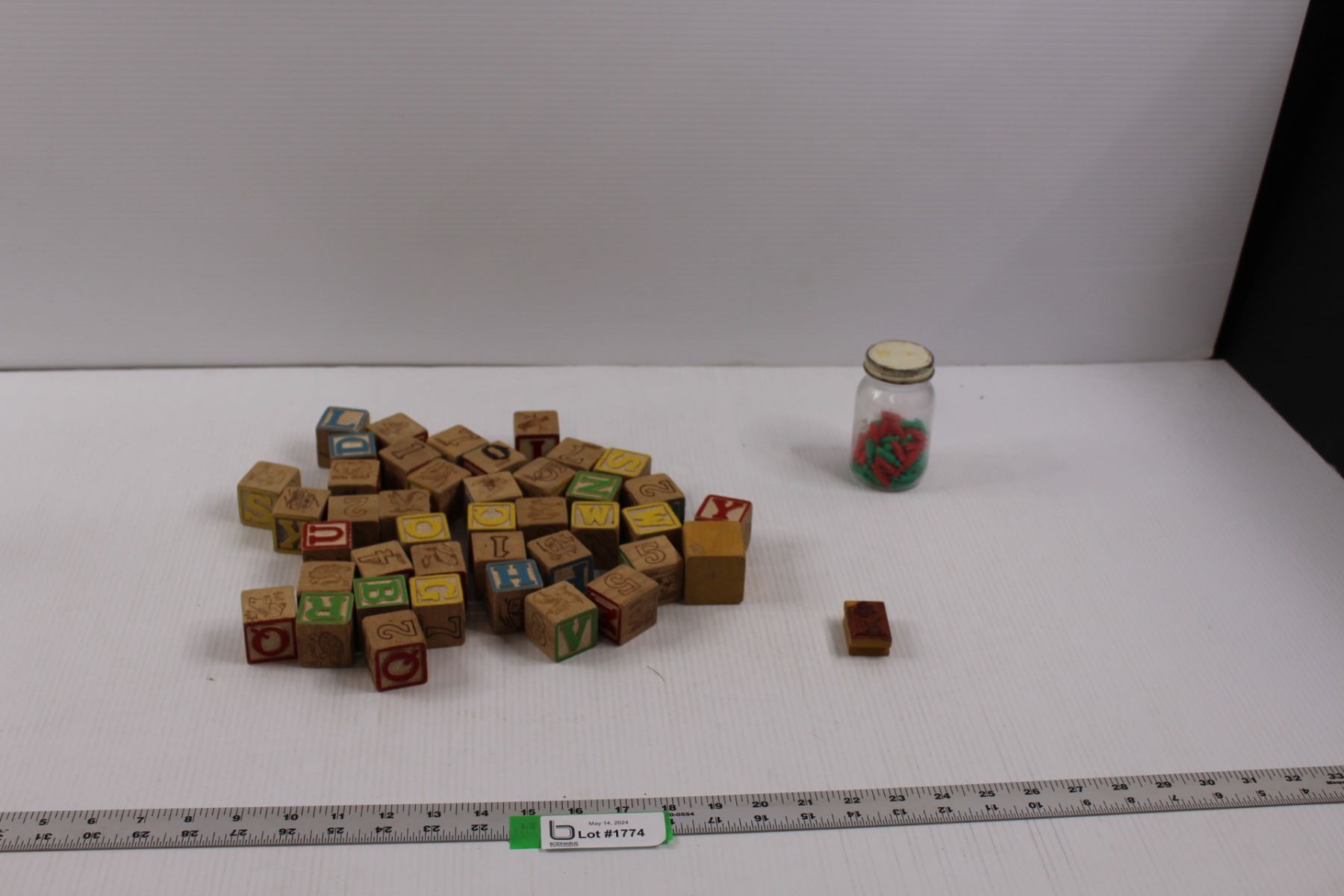 Childrens Blocks, Olive Oil Rubber Stamp & A Jar Of Mini Clothes Pins w/String