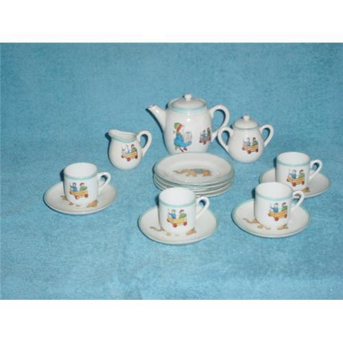 Vintage Made in Japan. Elephant tea set.The plates and saucers have an elephant on them and the other pieces have 2 children in a wagon, and the tea pot also has a girl with an accordian. Includes:3 cups 1-3/4" tall,4 3-1/4" saucers, 4 4-1/4" plates,cream and sugar and 4" teapot. One plate has a hairline about 1-1/2" long and the teapot lid has been glued together. Otherwise good condition (Sorry one cup has been shattered so there are only 3 cups.)
