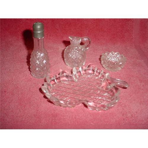 Childrens English Hobnail condiment set. The tray is 5" x 4", shaker is 3-3/4", open salt 1-3/4" and cruet 2-1/4".Good condition.except the shaker has roughness and niks on the opening under the lid, but someone told me all the blown ones are like this, and there is no stopper for the cruet.