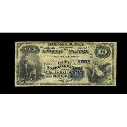 <B>Childress, TX</B></I> - $10 1882 Value Back Fr. 577 <B>The City NB</B></I> Ch. # (S)5992<BR>A truly scarce west Texas bank from the only community in this panhandle county to issue. This bank is the only chance to collect a large-size example from Childress, as two banks are unreported, and the other was a small-size only issuer. Seven notes are listed in the census, but three are impounded, perhaps forever, in the Philpott-Moody holdings. <B>Fine.</B></I><BR><BR><b>Shipping:</b> Coin/Currency (<a target="_blank" href="http://www.heritageauctions.com/common/shipping.php">view shipping information</a>)