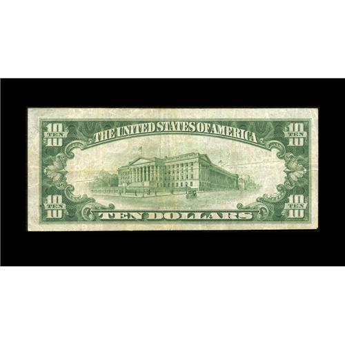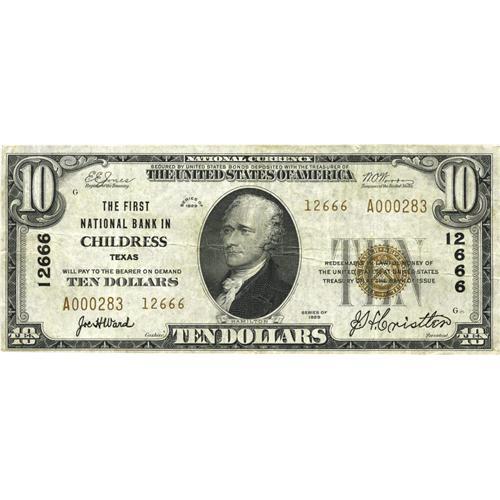 <B>Childress, TX</B></I> - $10 1929 Ty. 2 <B>The First NB</B></I> Ch. # 12666<BR>Though Childress had as many as three National Banks operating at one time, this institution was Chartered in 1925, four years after the last of the original three banks closed its doors. Only a handful of notes are known on this bank and this is one of the better specimens according to the census. <B>Very Fine.</B></I>