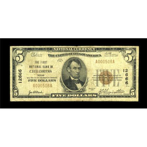<B>Childress, TX</B></I> - $5 1929 Ty. 1 <B>The First NB</B></I> Ch. # 12666<BR> This is one of only 9 small on a just plain rare bank that chose to issue small notes only despite receiving its charter in 1925. <B>Fine</B></I>.<BR><BR><b>Shipping:</b> Coins & Currency (<a target="_blank" href="http://www.heritageauctions.com/common/shipping.php">view shipping information</a>)