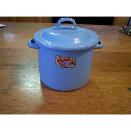 Wonderful blue sterilizer-childs toy size-with original rack inside and 7 glass doll bottles.All the rubber tops are there but one is broken.Darling little set.Great for the toy collector.Measures 5" tall to top of cover.