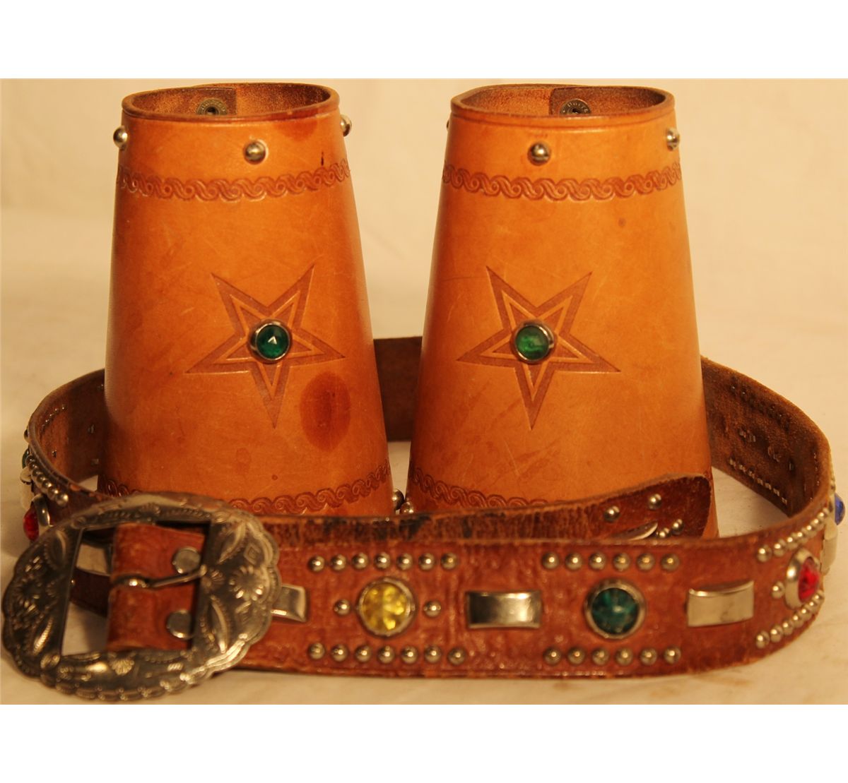 Matching Set of Childs Wrist Cuffs and Belt; A super nice set with light colored leather and tooling and rhinestones.