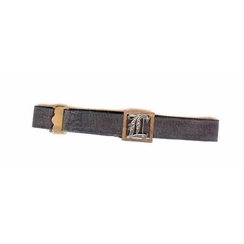 Early Victorian. Circa 1850 this English childs bracelet consists of a black Grosgrain band with an adjustable clasp, in perfect working order. The square of gold marked "9ct" has in the center the letter "L" in Mine cut diamonds one of which is missing. Pure Victoriana.The square of Gold measures 5/8" X 5/8", 6 minecut diamonds (there should be 7) and the band is 3/8" wide.
