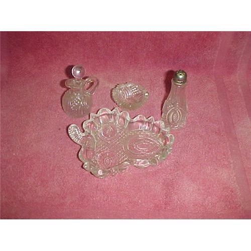 Childs Hickman Condiment Set. Includes 5" x 4" tray, 2" open salt, 3-1/4" Shaker, & 3" cruet & stopper. The shaker is badly chipped under the lid, but the lid still screws on just fine. and I think the stopper may have a chip on the end as its uneven.