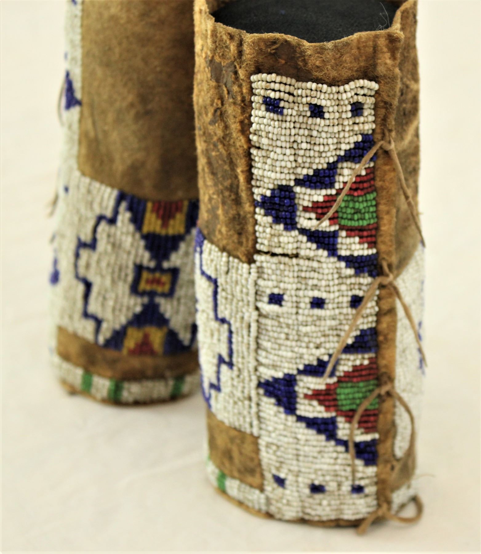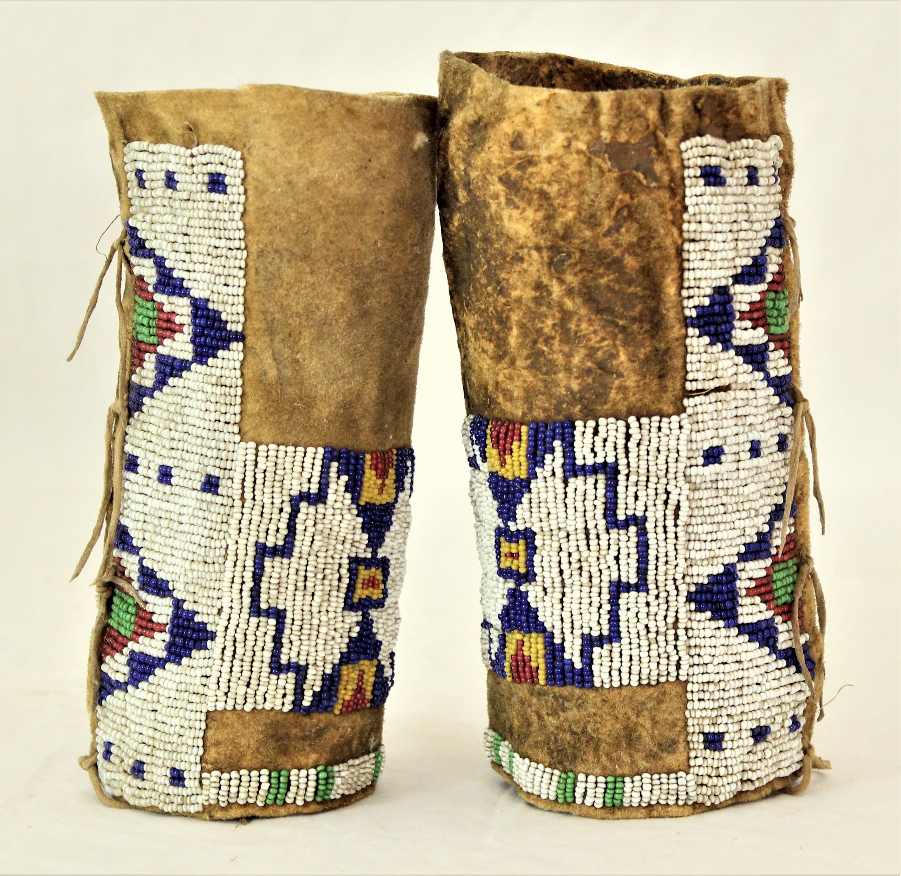 Nice pair of brain tanned leggings, circa 1890, done with a large geometric pattern using early white heart, greasy yellow and cobalt blue beads on a white background, measuring 7" tall.