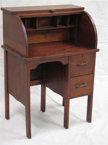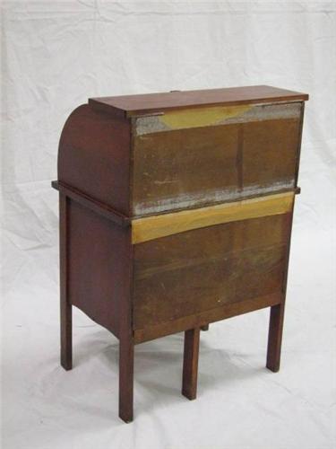 Child's Roll Top Desk with five pigeon holes and two drawers. Dimensions: 34.75"H x 24"W x 16"D