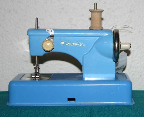 Child’s hand cranked sewing machine marked with Signature Junior decal on the arm. A little of the “Junior” is worn away. Blue enamel paint on sheet steel with nickel plate and mech. Blue paint is good overall. Base measures approximately 4" x 8". Approximately 7" H.