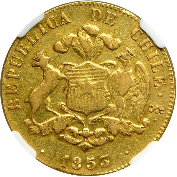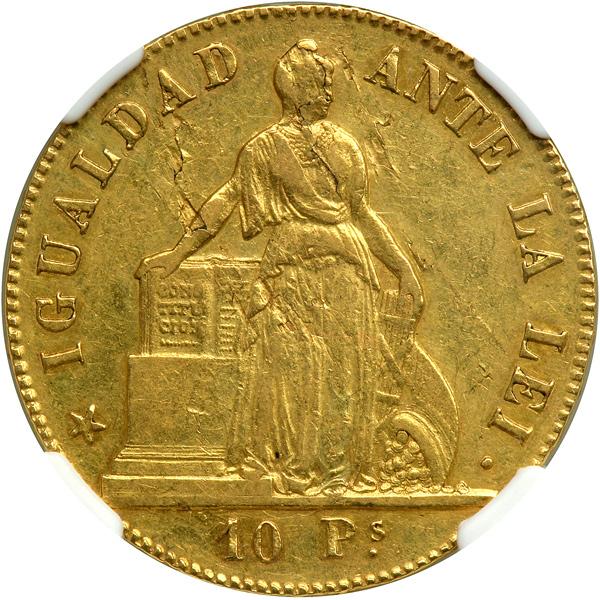 Chile. 10 Pesos, 1853-So. Fr-45; KM-123. Weight 0.4414 ounce. Liberty standing at altar. Reverse: Arms. Obverse planchet lamination marks. NGC graded VF-25.