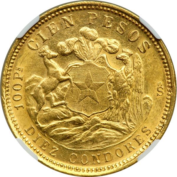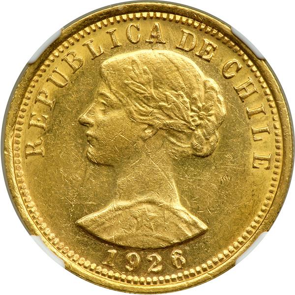 Chile. 100 Pesos, 1926-So. Fr-54; KM-170. Weight 0.5885 ounce. Liberty head left. NGC graded AU-58.