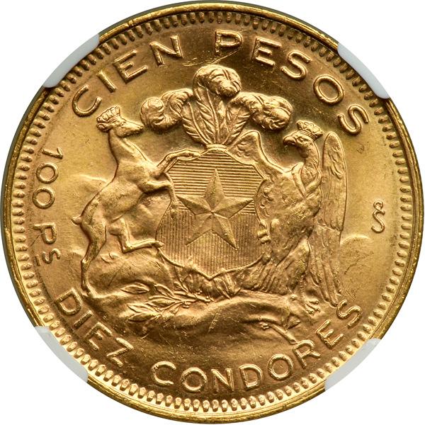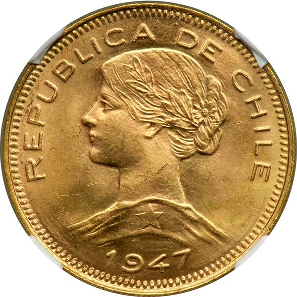 Chile. 100 Pesos, 1947-So. Fr-54; KM-175. Weight 0.5885 ounce. Liberty head with coiled hair left. NGC graded MS-63.