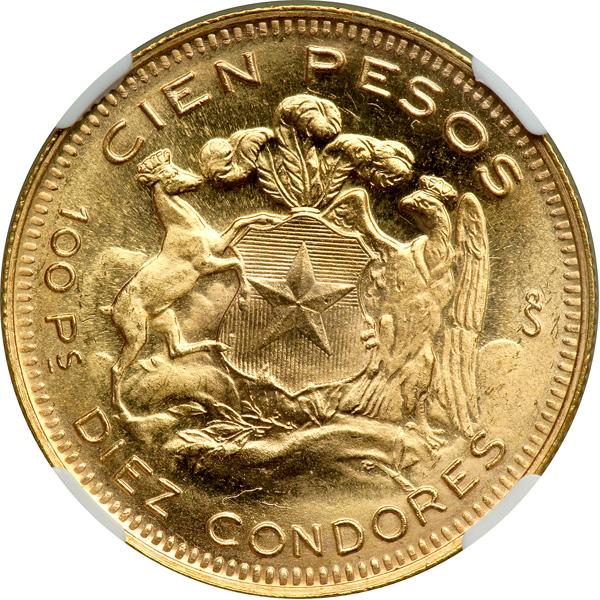 Chile. 100 Pesos, 1959. Fr-54; KM-175. Weight 0.5885 ounce. Liberty head left. NGC graded MS-62.