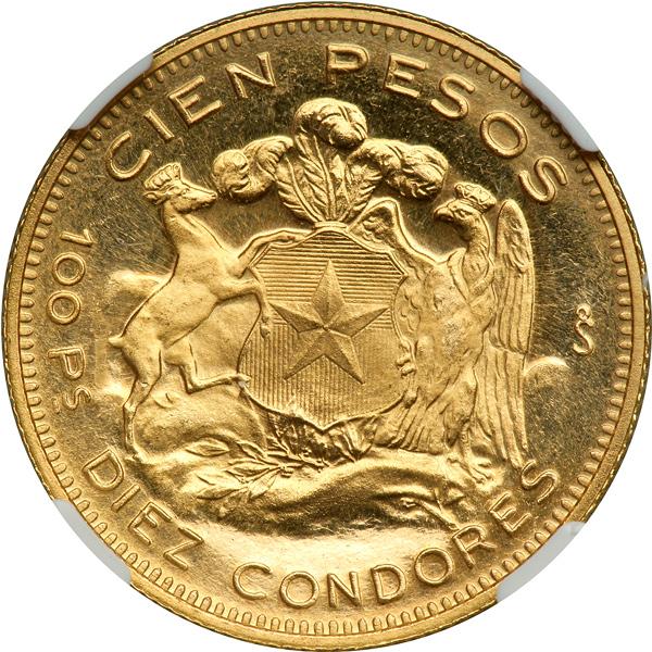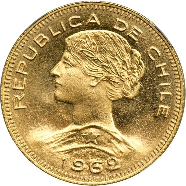 Chile. 100 Pesos, 1962-So. Fr-54; KM-175. Weight 0.5885 ounce. Liberty head. NGC graded MS-66.