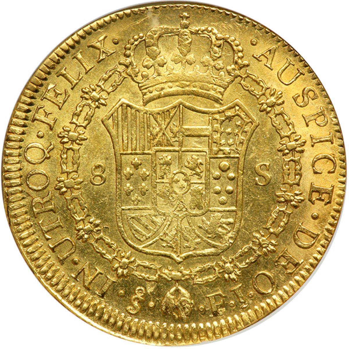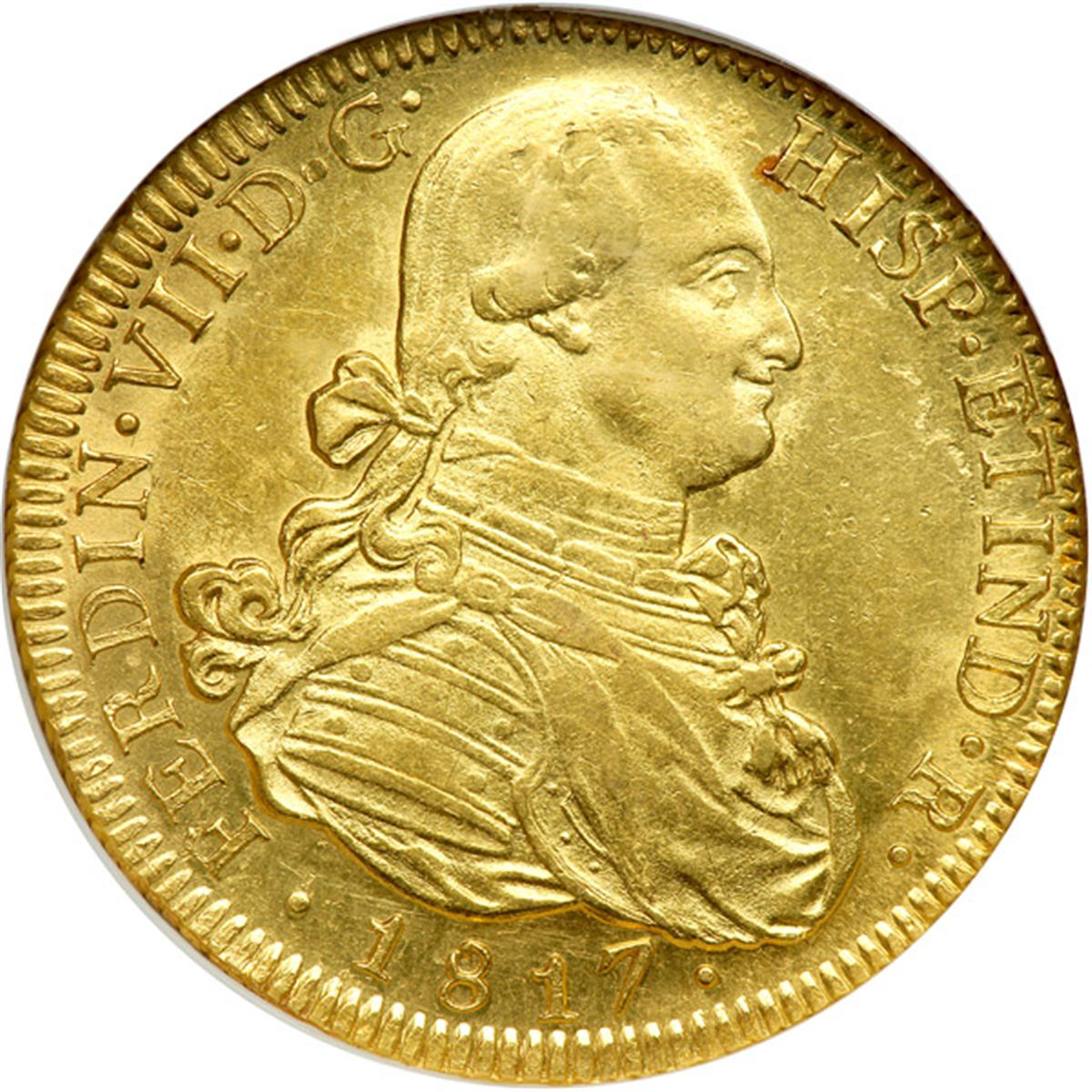 Chile. 8 Escudos, 1817-So FJ. Fr-29; KM-78. Ferdinand VII. Bust of Charles IV right. Reverse: Crowned arms, Order of Golden Fleece around. NGC graded AU-55.