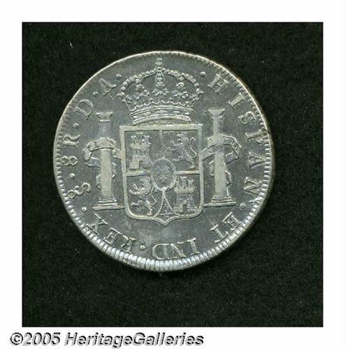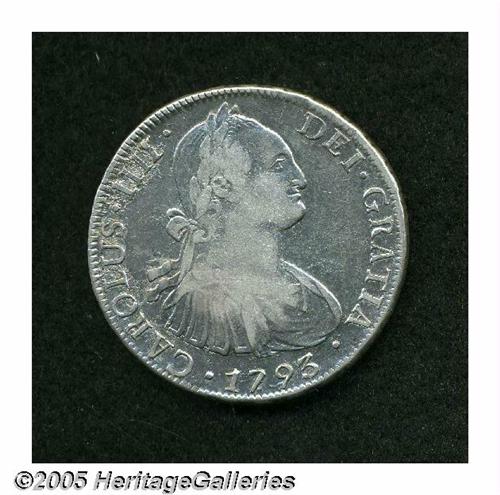 <B>Carlos IIII 8 Reales 1793-DA, </B></I>KM51, nice AVF, very lightly cleaned long ago and now toning, softly struck obverse but with no noticeable damage.