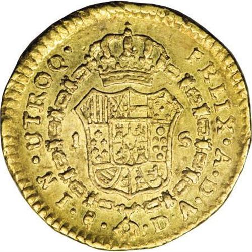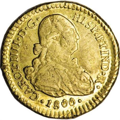<B>Carlos IV gold Escudo 1800-DA,</B></I> KM61, lustrous XF, crudely struck with a light flan lamination on the King's cheek. Very scarce type and grade.<BR><BR><b>Shipping:</b> Coins & Currency (<a target="_blank" href="http://www.heritageauctions.com/common/shipping.php">view shipping information</a>)