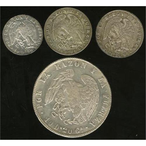 <B>Early Republic Silver Quartet,</B></I> KM94.2 Real 1844-IJ, lightly dipped but XF-AU with bold details and considerable original mint luster, KM100.2 2 Reales (2), 1848-JM, toned VF-XF and 1849-ML, toned VF-XF, both very nice examples, and KM96.1 8 Reales 1839-IJ, boldly struck VF-XF, harshly cleaned long ago and now lightly toned, small scratches in the obverse central fields. <B>Sold as is, no return lot.</B></I><BR><BR><b>Shipping:</b> Coins & Currency (<a target="_blank" href="http://www.heritageauctions.com/common/shipping.php">view shipping information</a>)