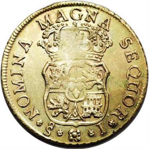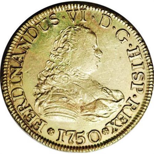 <B>Ferdinand VI gold 4 Escudos 1750-J,</B></I> KM2, lustrous AU, minor handling in the right obverse field and slightly weakly struck on the center of the reverse, but an attractive example from the wreck of the Nuestra Senora de la Luz - River Plate Treasure. With the certificate of authentication.<BR><BR><b>Shipping:</b> Coins & Currency (<a target="_blank" href="http://www.heritageauctions.com/common/shipping.php">view shipping information</a>)