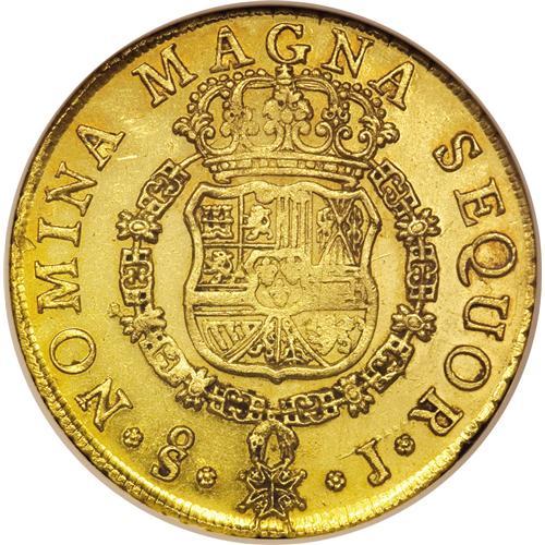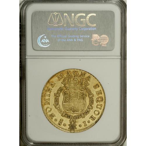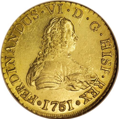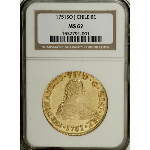 <B>Ferdinand VI gold 8 Escudos 1751-J, </B></I>KM3, MS62 NGC, fully brilliant and well-struck example with typical small contact marks in the obverse fields. Most high grade coins of this type were recovered in the River Plate treasure from the Nuestra Senora de la Luz.<BR><BR><b>Shipping:</b> Coins & Currency (<a target="_blank" href="http://www.heritageauctions.com/common/shipping.php">view shipping information</a>)