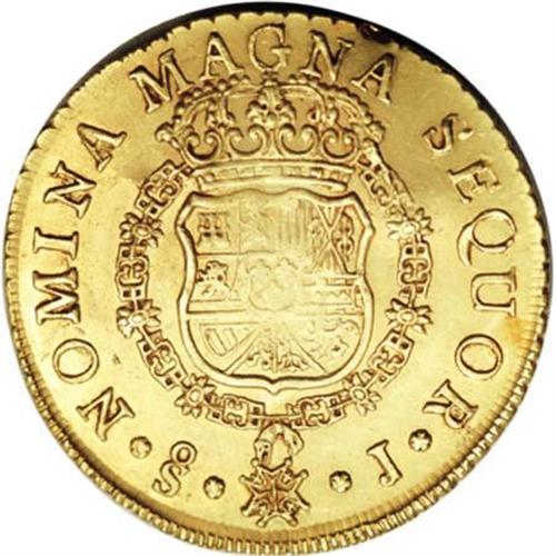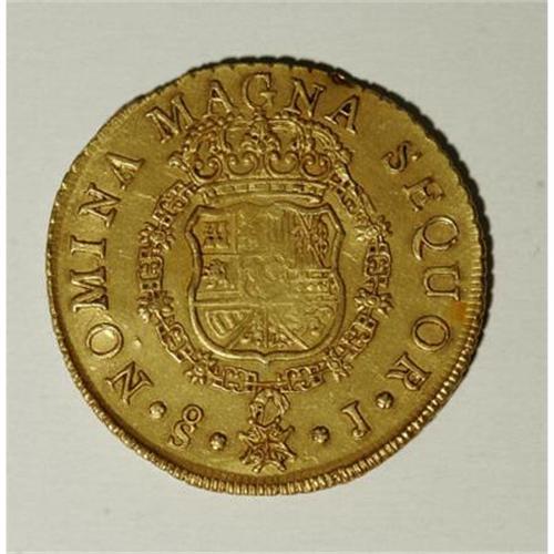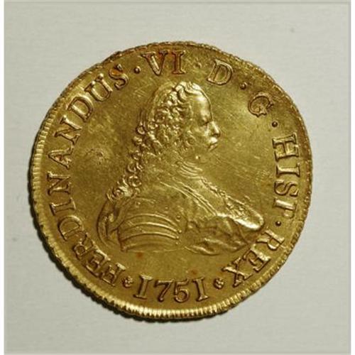 <B>Ferdinand VI gold 8 Escudos 1751J,</B></I> KM3, lustrous AU-UNC, nicely struck with no adjustment marks, small depression in the left obverse field with some tiny peck marks and one rim nick on the reverse at 1 o'clock. The surfaces are well above average for these treasure coins from the Nuestra Senora de la Luz.<BR><BR><b>Shipping:</b> Coins & Currency (<a target="_blank" href="http://www.heritageauctions.com/common/shipping.php">view shipping information</a>)