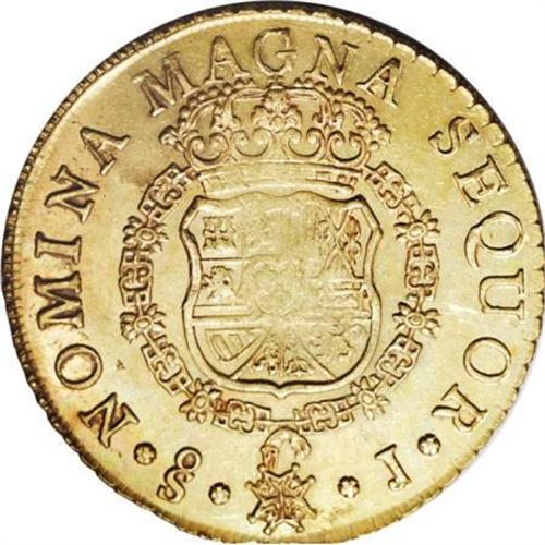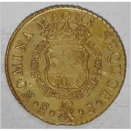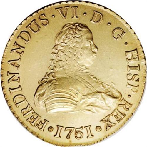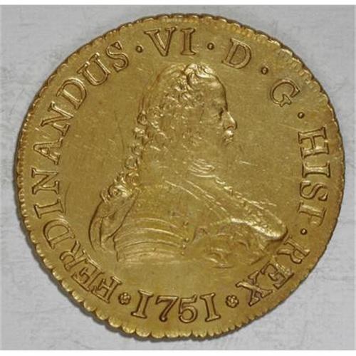 <B>Ferdinand VI gold 8 Escudos 1751J,</B></I> KM3, lightly toned AU-UNC, few faint surface marks on the obverse, but an attractive example of this popular type. <BR><BR><b>Shipping:</b> Coins & Currency (<a target="_blank" href="http://www.heritageauctions.com/common/shipping.php">view shipping information</a>)