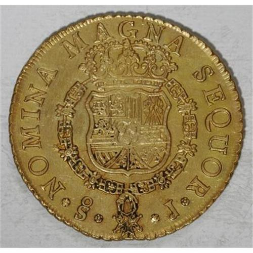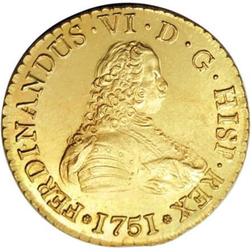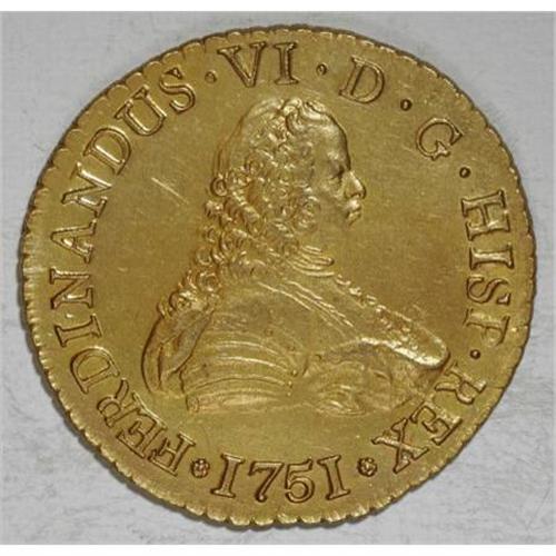 <B>Ferdinand VI gold 8 Escudos 1751J,</B></I> KM3, choice AU-UNC, lightly toned and exceptionally attractive. The strike is superior and the surfaces are virtually blemish-free. One of the nicer examples that you will see from the treasure of the Nuestra Senora de la Luz and worth a premium.<BR><BR><b>Shipping:</b> Coins & Currency (<a target="_blank" href="http://www.heritageauctions.com/common/shipping.php">view shipping information</a>)